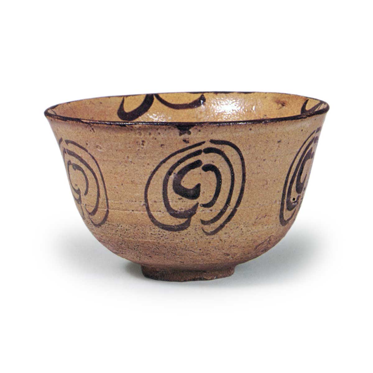 绘唐津屈轮纹茶碗 唐津绘唐津屈轮纹茶碗 2025.08.01 绘唐津屈轮纹茶碗 高度9.5厘米,口径15.5厘米,高台径5.3厘米碗口微微外翻,碗身深而宽,与口径相比,高台较小且低矮。碗身五方中央以轻松笔触绘制分隔的三重圆纹,内侧口缘四方饰草纹,口缘环绕铁绘颜料,内部全面及外部高台边缘均薄涂长石釉。虽无法确定具体窑址,但此作风格独特,属罕见绘唐津作品。