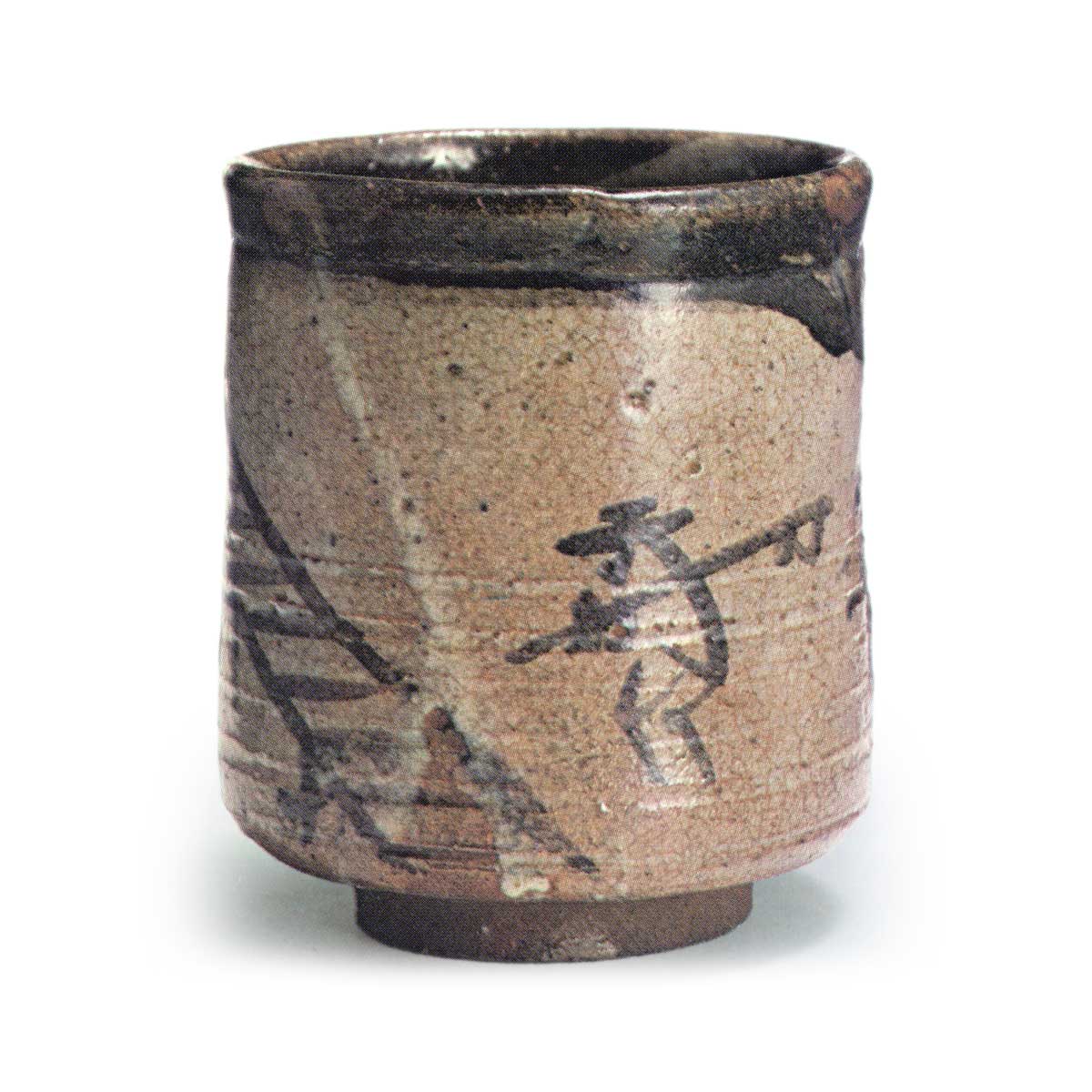 绘唐津钓鱼人物纹筒形茶碗 唐津绘唐津钓鱼人物纹筒形茶碗 2025.08.01 绘唐津钓鱼人物纹筒形茶碗 高度9.4厘米,口径7.5厘米,高台径4.8厘米该茶碗最初是茶碗还是向付(一种盛小菜的器皿)已无法确定,目前作为茶碗使用。该茶碗略呈筒形,底部略微外扩,口部环绕铁釉,器身绘有两名钓鱼人物、桥梁及芦苇等图案,内外均施釉。釉面烧制柔和,高台部分呈片薄状,应为内田皿屋或甕屋谷窑的作品。