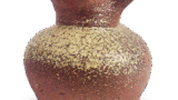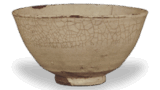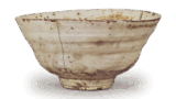 绘唐津沓茶碗 唐津绘唐津沓茶碗 2025.08.01 绘唐津沓茶碗 高度6.2厘米 口径11.7×16.6厘米 高台径5.3厘米这同样是沓形茶碗,推测为内田皿屋窑的作品。腰部设有阶梯,高台低矮圆润, 器身以铁绘颜料刷出刷痕,呈现黑刷痕风格,内壁饰有类似熨斗和剪刀的奇特纹样。内外釉层薄,呈灰褐色釉面。高台周围的土质含铁量高,质地细腻。