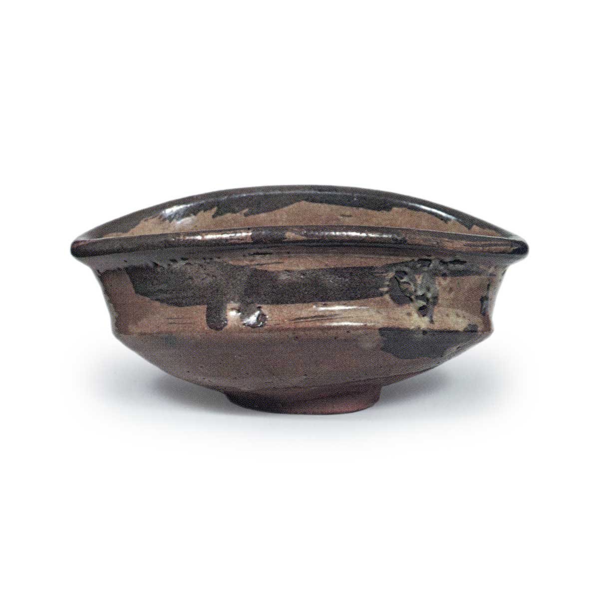 绘唐津沓茶碗 唐津绘唐津沓茶碗 2025.08.01 绘唐津沓茶碗 高度7.4厘米 口径11.4×16.9厘米 高台直径5.6厘米梅泽纪念馆与绘唐津山水纹沓茶碗完全同款的沓形茶碗,推测为甕屋谷窑的作品。高台部分小巧削制, 高台内侧削刻较浅, 底部边缘饰有三日月形雕刻。口缘环绕铁釉, 器身一侧饰有桥形纹样,另一侧则饰有模糊的景观纹样, 均以粗犷笔触大胆绘制。 釉面融和, 呈现偏红的柔和色调。