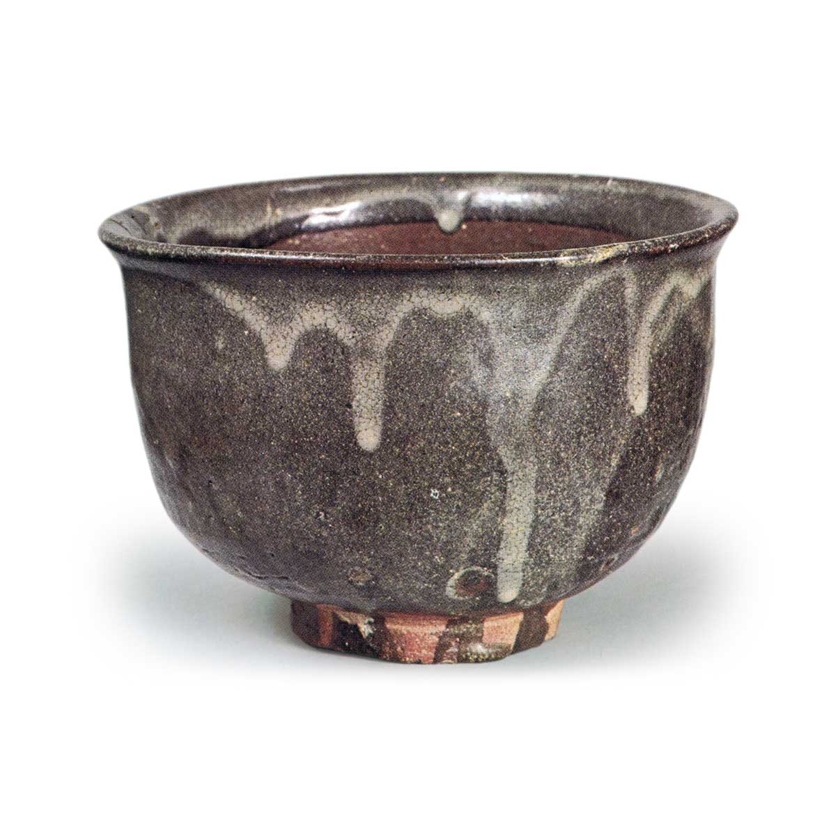 黑唐津茶碗 唐津黑唐津茶碗 2025.08.02 黑唐津茶碗 高度9.9厘米 口径14.5厘米 高台径6.1厘米边缘外翻的宽口茶碗,其造型与高丽茶碗的熊川相似,是唐津地区较为罕见的茶碗形态。整体厚实,高台略高,内部削刻深邃有力。内外均施铁釉,口部至外侧再覆长石釉,内部呈茶褐色烧成。该茶碗为近年在牛石窑址出土的文物。