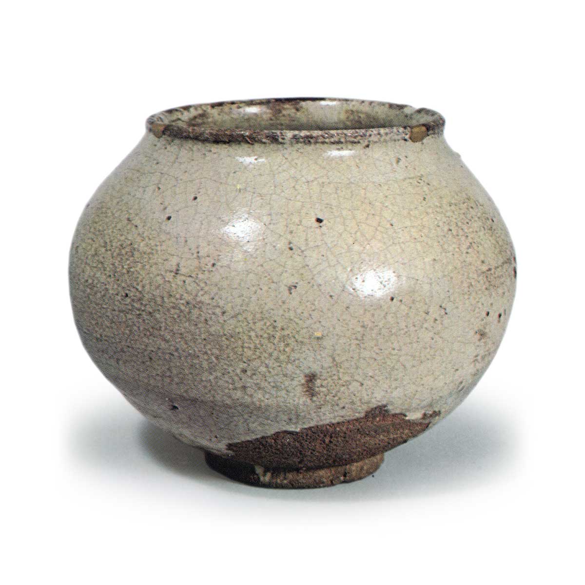 斑唐津壶 唐津斑唐津壶 2025.08.02 斑唐津壶 胴径15.4厘米俗称斑唐津壶。白濁色的稻草灰釉覆盖至腰部,器形圆润,轮廓丰满,高台也自然地粗犷地削出。 在唐津的壶中尤为素朴, 属于岸岳系帆柱窑烧制。此类白浊色的稻草灰釉在韩国南部尚未见记载,因与朝鲜北部会宁烧的同类作品相似,推测可能是由朝鲜北部陶工归化后所创,但其土质、高台的削制等细节与会宁烧极为相似,甚至难以分辨,因此推测应为唐津早期作品。