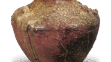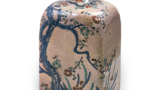 绘唐津草纹壶 唐津绘唐津草纹壶 2025.08.02 绘唐津草纹壶 高度12.3厘米,口径9.9厘米,胴径14.7厘米,底径6.4厘米推测为松浦系狼ヶ鞍窑的作品。 胴部两侧饰有草纹图案, 内外均施长石釉。 素地为混有细砂的白色,高台稍高, 高台内侧的削痕较浅。