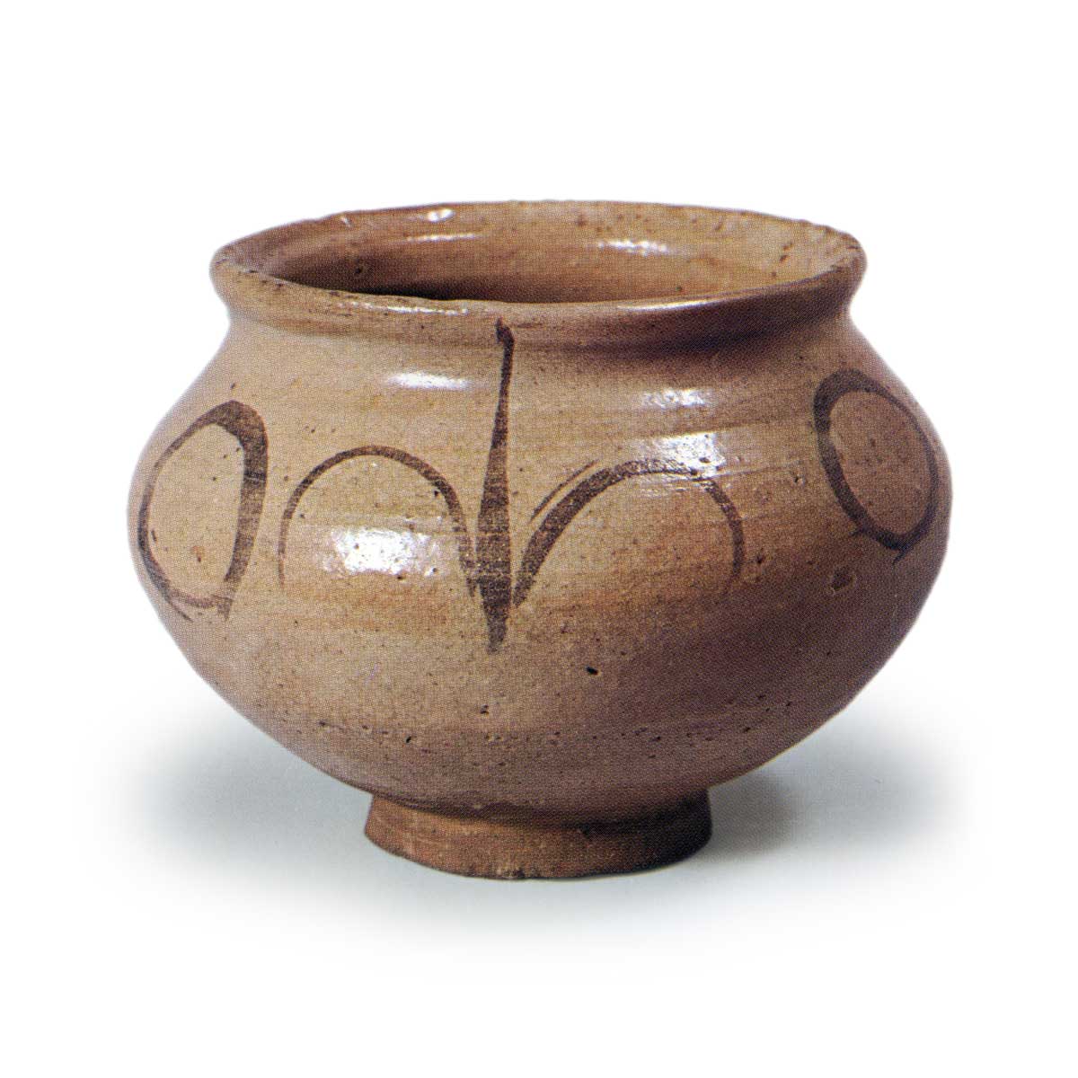 绘唐津草纹壶 唐津绘唐津草纹壶 2025.08.02 绘唐津草纹壶 高度11.0厘米 口径11.9厘米 胴径14.8厘米 底径6.2厘米口部呈端反形且宽阔,高台部分高耸而小巧,造型独特。胴部以草纹与圆纹交替装饰,笔触质朴,极具唐津风格。此器应为市之瀬高丽神窑的作品。