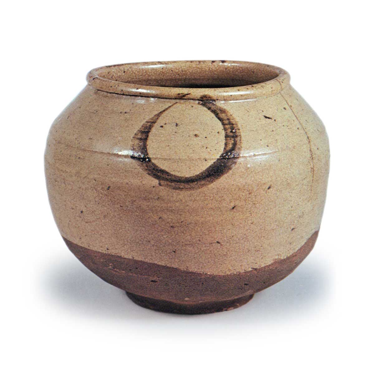 绘唐津丸文壷 唐津绘唐津丸文壷 2025.08.02 绘唐津丸文壷 高度14.4厘米 口径12.4厘米 胴径17.8厘米 底径8.1厘米口部扭曲反卷形成玉边,瓶身呈抚形,瓶身修长。高台部分以小巧的造型削制而成。瓶身一侧饰有圆纹,另一侧则以类似钓钩的圆纹图案装饰。釉面呈现枯叶色,釉质融化自然,高台周围露出红色粗糙的土质纹理。