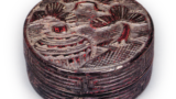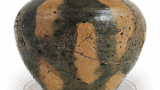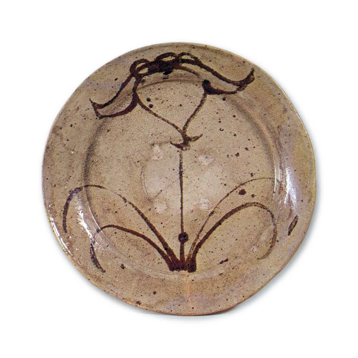 绘唐津菖蒲纹大盘 唐津绘唐津菖蒲纹大盘 2025.08.02 绘唐津菖蒲纹大盘 口径26.4厘米口部呈鐔缘状的大盘,盘面满布一株菖蒲,以娴熟的笔触绘制。高台呈圆形,小巧精致,高台周围可见市ノ瀬高丽神窑特有的细小长石颗粒,展现出独特的土质纹理。陶土中似乎含有铁粉,釉面呈现出如芝麻般的铁质纹理。该器物出土于市ノ瀬高丽神窑。盘面中央留有四个指痕。