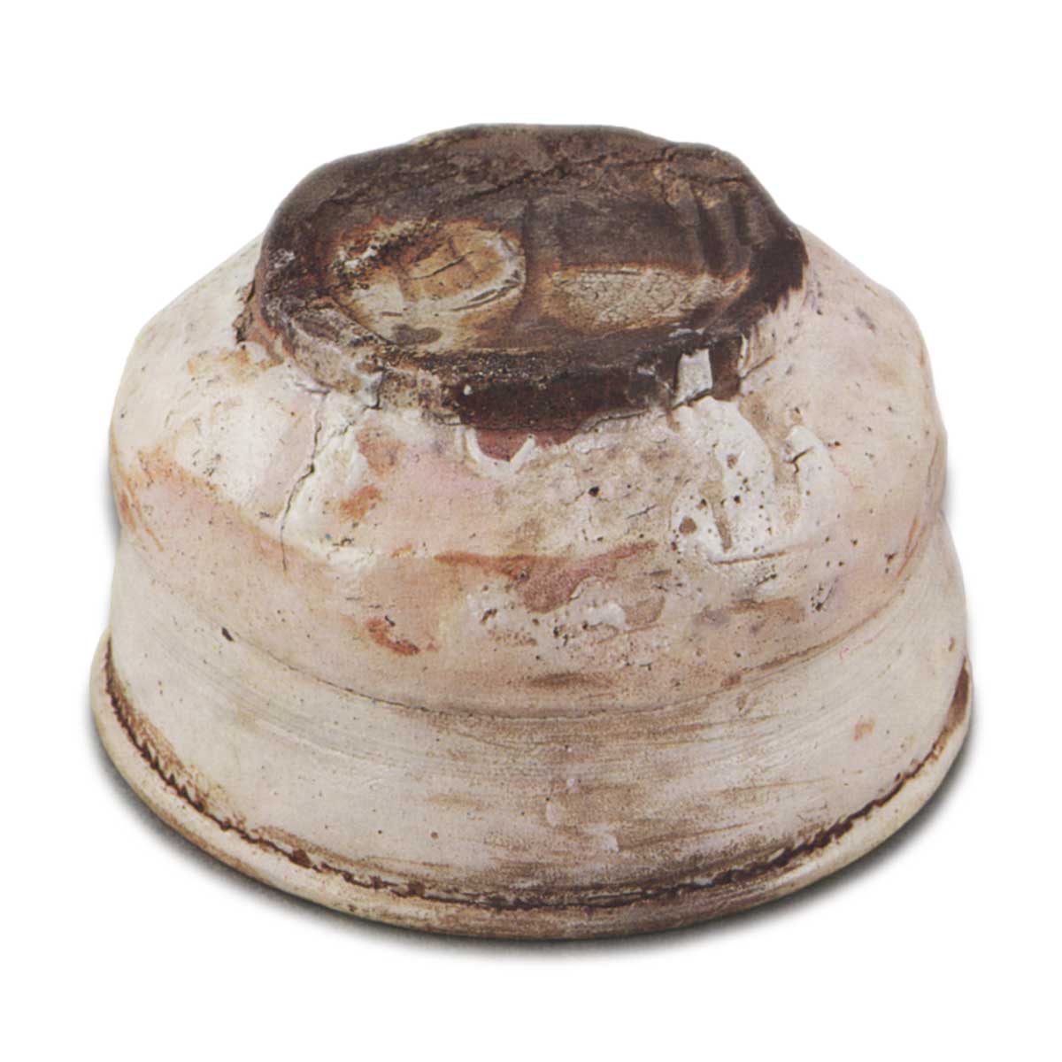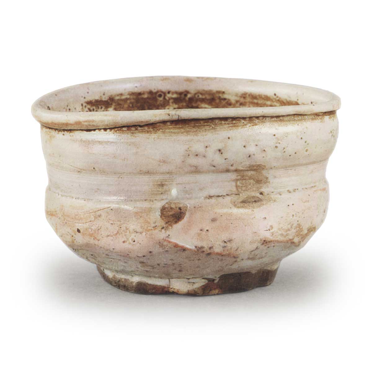虽然它是纯白色的,但器身因釉滴、釉未覆盖区域、指纹和粘附物而呈现出各种变化,为烧制后的有趣效果增添了各种景致。 唯一的瑕疵是碗腰和碗底有几处缺口,但边缘没有一处裂纹,这使它成为一只近乎完美的茶碗。