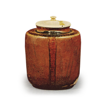 这是遵循茶道主流的茶入,是绍鹭遗爱之品,以鸿池传世而闻名。端庄的造型,让人联想到泰然自若地端坐着的贵公子。釉色整体呈现出鲜明的变化,三道釉色在器形上流淌汇聚,露水停驻的景象也颇具趣味。腰部低处釉色脱落形成圆润的装饰,堪称赏美之作。