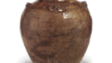 绘唐津草花纹手付大鉢 唐津绘唐津草花纹手付大鉢 2025.08.03 绘唐津草花纹手付大鉢 高度14.3厘米 口径23.9~26.0厘米 底径11.1厘米出光美术馆碗口呈端反形,碗身较厚,左右两侧附有换纽状把手。外侧两面绘有粗犷的草花纹样,笔触稚拙。耳部施铁釉,内部口边亦饰铁绘。窑址不详,为罕见作例。