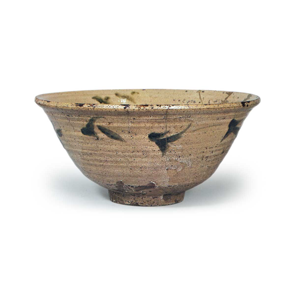 绘唐津胆礬草纹大鉢 唐津绘唐津胆礬草纹大鉢 2025.08.03 绘唐津胆礬草纹大鉢 高度14.5厘米 口径30.5厘米 底径10.2厘米碗口呈朝颜形,开口宽大,内外均以胆礬釉绘制唐草纹样。此类器物较为罕见,但制作年代可能稍晚。推测为椎峰窑作品。碗内壁留有七处指痕。