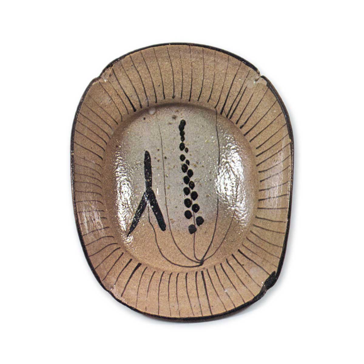 绘唐津水草纹小鉢 唐津绘唐津水草纹小鉢 2025.08.03 绘唐津水草纹小鉢 高度6.9厘米 口径13.4×17.8厘米 底径6.2厘米开口呈椭圆形的碗,四边收拢。碗内饰有水草纹样,口部周围以细腻轻盈的线条勾勒出纹样。在绘唐津小鉢中极为罕见的优雅造型, 高台厚实且单薄削出, 釉面光滑融化。 可能是多久高丽谷窑的作品。