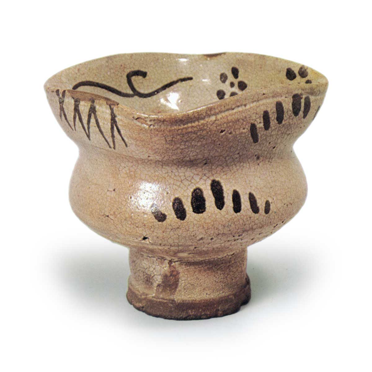 绘唐津高脚小鉢 唐津绘唐津高脚小鉢 2025.08.03 绘唐津高脚小鉢 高度10.5厘米 口径10.6×10.6厘米 底径5.7厘米梅泽纪念馆高脚小碗,碗身收紧,开口处向四面展开。 碗身两侧饰有檜垣纹和点斑纹, 内侧口部周围绘有梅鉢和唐草纹样。 高台内侧呈圆形深凹。 推测为甕屋谷窑作品。