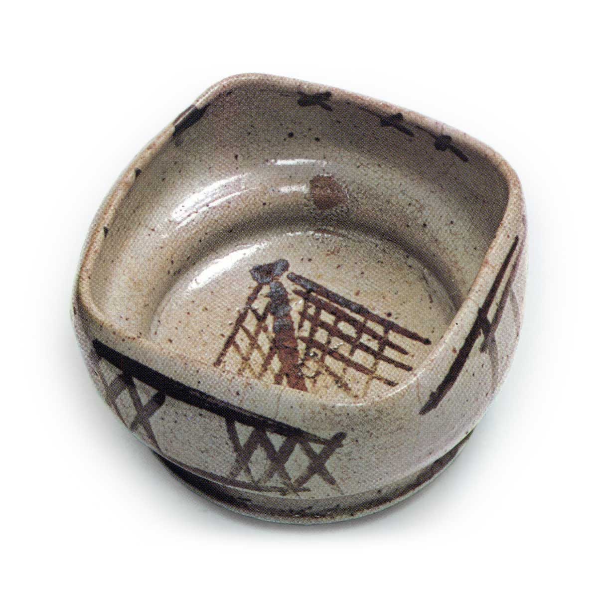 绘唐津网干纹小鉢 唐津绘唐津网干纹小鉢 2025.08.03 绘唐津网干纹小鉢 高度7.8厘米 口径12.0厘米 高台径6.3厘米腰部带有阶梯状设计的小碗,口部向四面延伸,底部呈圆形。碗内绘有渔网晾晒的图案,外侧饰有檜垣和瓔珞风格的纹样,以及枪尖纹等,纹样构图与志野的向付等作品相似,应为内田皿屋窑的作品。