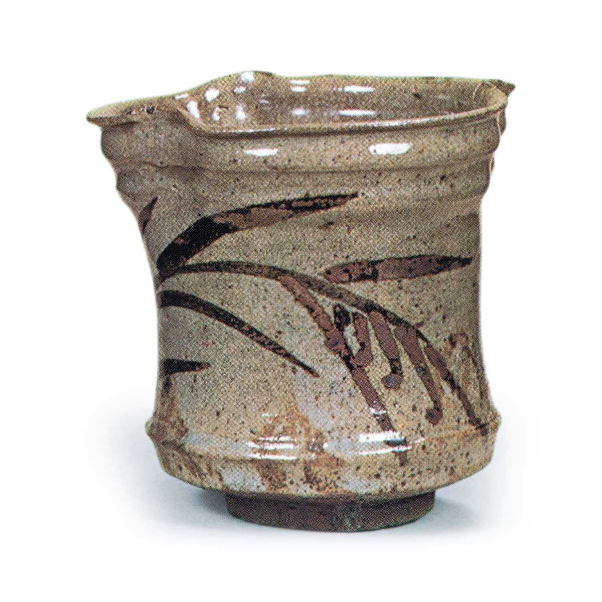 绘唐津芒纹筒形向付 唐津绘唐津芒纹筒形向付 2025.08.03 绘唐津芒纹筒形向付 高度11.5厘米腰部设有阶梯,口部略微张开并同样设有阶梯,三面收口,筒形向付,筒身清晰地描绘出一株芒草纹样。釉面烧制均匀,在绘唐津向付中堪称杰作之一。应为市之瀬高丽神窑作品。曾为五客成对。