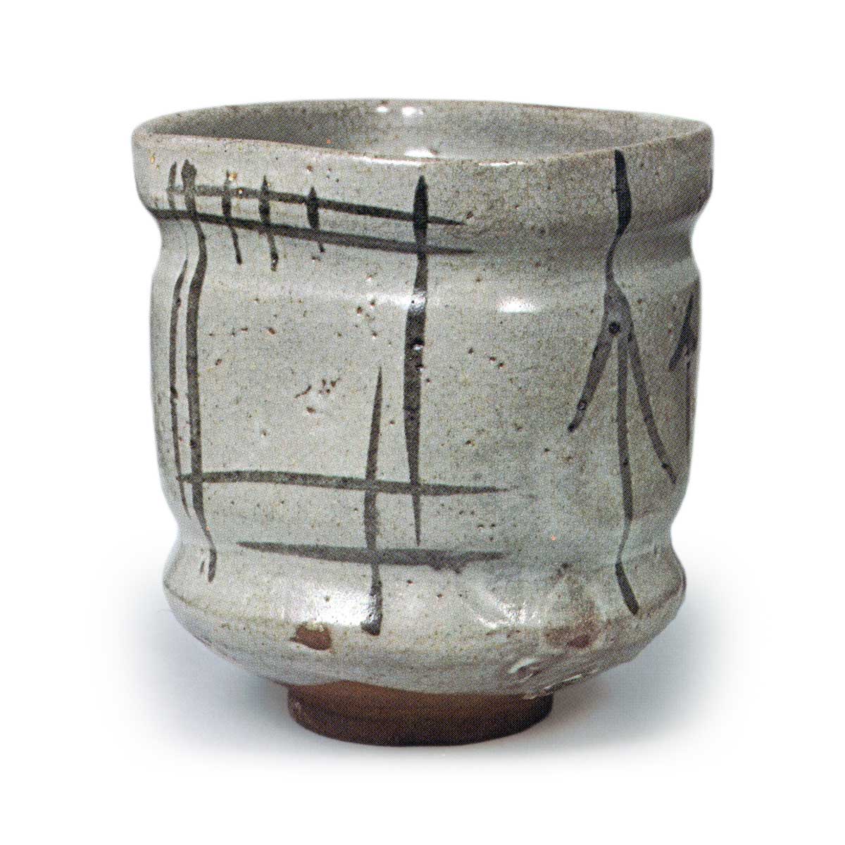 绘唐津口四方向付 唐津绘唐津口四方向付 2025.08.03 绘唐津口四方向付 高度11.0厘米 口径8.6×9.2厘米 底径4.9厘米器身以流畅的笔触描绘了四目垣、枪尖、横纹等纹样,其中一侧还饰有类似杉菜的纹样,颇具特色。这些纹样在筒向付中尺寸较大,制作工艺精良,因此常被用于火入。据推测,此器可能出自阿房谷窑。