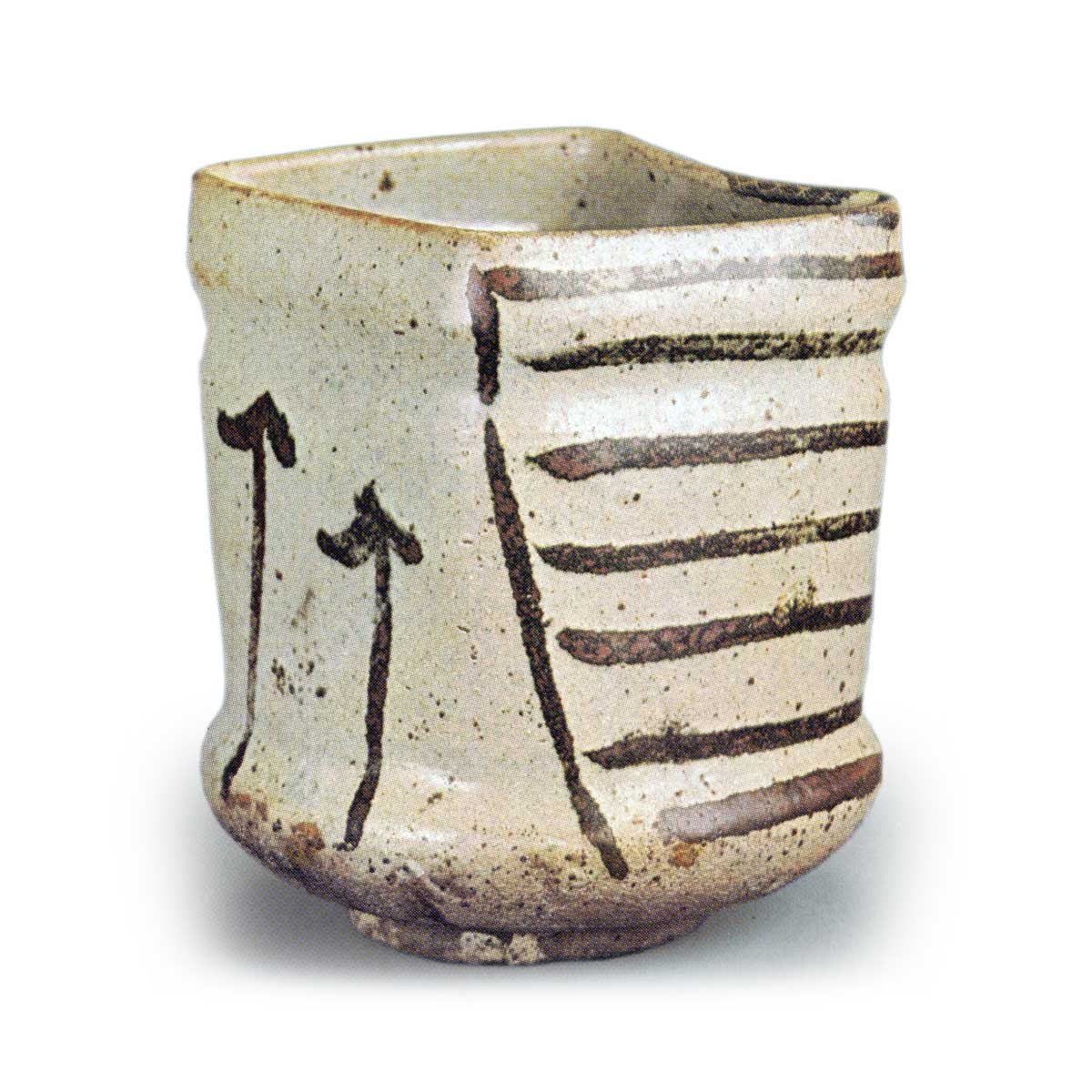绘唐津口四方向付 唐津绘唐津口四方向付 2025.08.03 绘唐津口四方向付 高度10.5厘米 口径6.6×7.6厘米 底径5.0厘米该作品受到志野风格的影响,推测可能出自阿房谷窑。两件作品的器身均以流畅的笔触描绘了四目垣、枪尖、横纹等纹样,其中图175的一件还呈现出类似杉菜的纹样,颇具特色。这些作品作为筒向付而言尺寸较大,且制作工艺精良,因此被用于盛放热食。