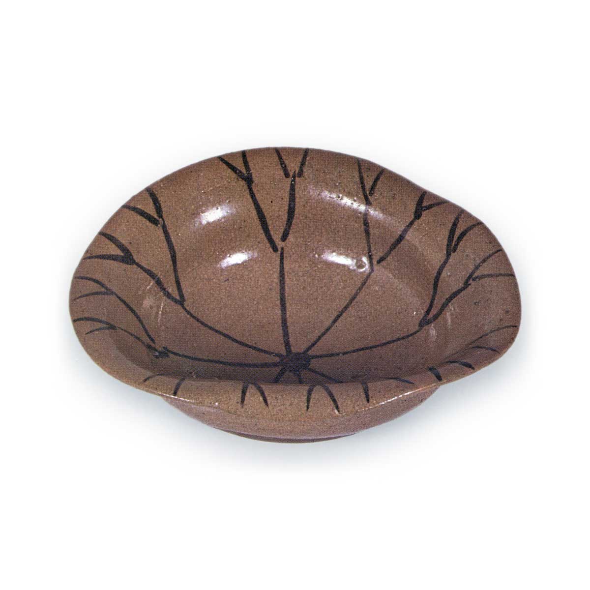 绘唐津莲叶形向付 唐津绘唐津莲叶形向付 X Facebook Hatena Bookmark LINE Pinterest 复制 2025.08.03 绘唐津莲叶形向付 绘唐津莲叶形向付 高度5.9厘米 口径13.8×16.3厘米 底径4.9厘米口部呈端反形,略浅的向付,器形整体仿莲叶造型,器内满布叶脉纹样,造型简洁优雅的小碗。高台部分小巧削制,红色陶土质地细腻紧实。在多久高丽窑出土有类似的碎片。