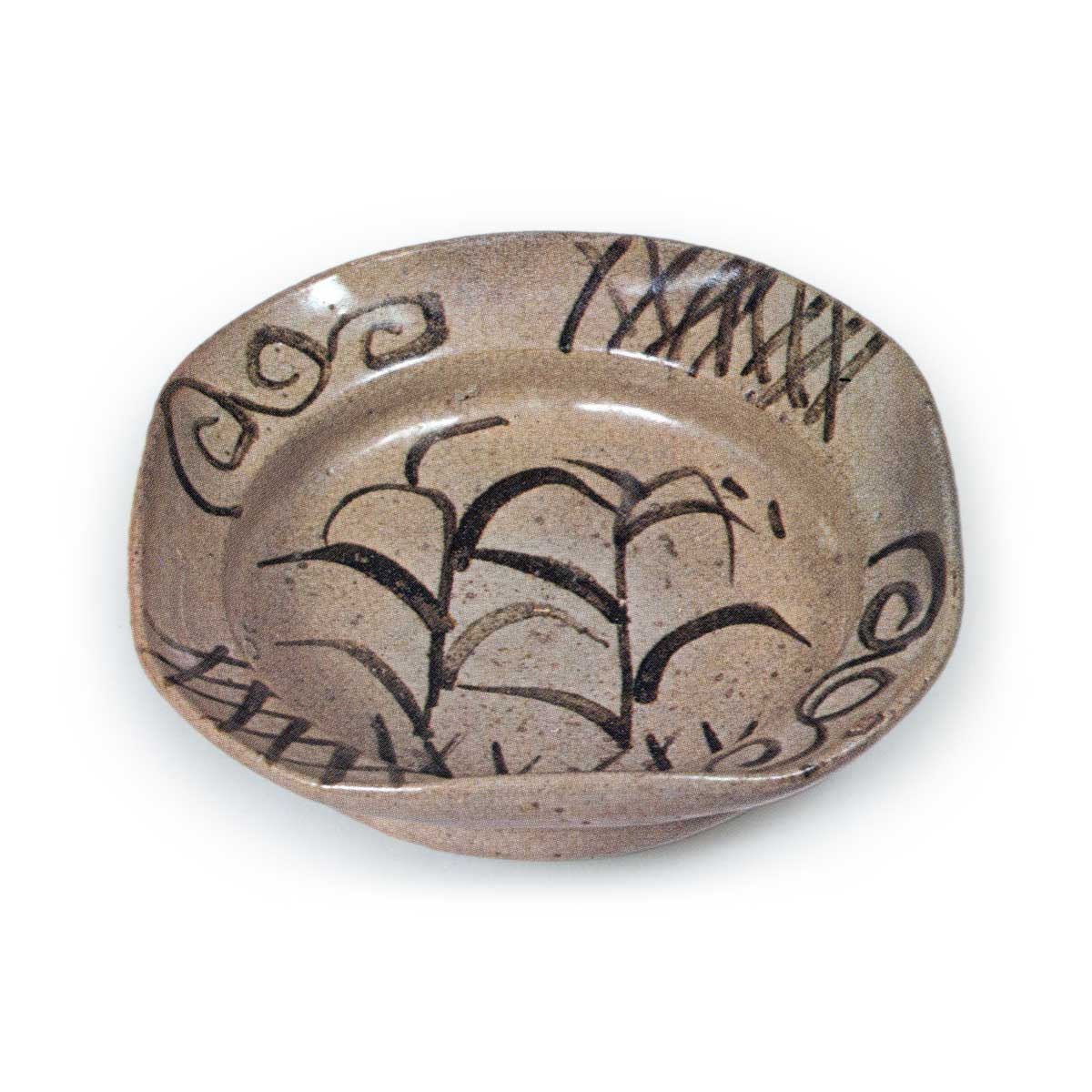 绘唐津草纹向付 唐津绘唐津草纹向付 2025.08.05 绘唐津草纹向付 高度5.3厘米 口径15.2厘米 底径5.9厘米口部呈鐔状张开,四边向内收拢的抚四方形向付,内壁绘有两株草纹,口部周围饰有檜垣和屈轮纹样。高台部分被小心地削去。与鼠志野向付相似的设计。疑似阿房谷窑作品。