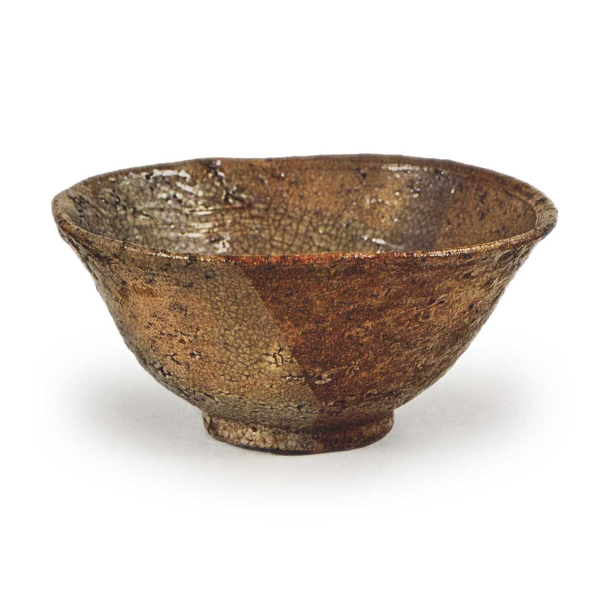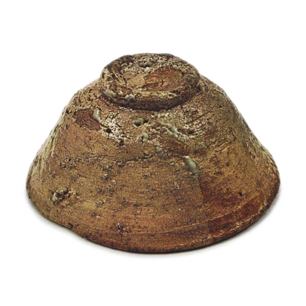 这款茶碗之所以能俘获茶道爱好者的心,是因为它拥有丰富的釉彩图案。 釉料以所谓的“katamigawari”风格施涂,一面是薄薄的棕灰色ira-po釉,另一面是深棕色iro-yu釉。此外,在碗的内侧,有两层iro-yu釉以大胆的笔触勾勒出图案,使碗的内壁更具质感。 如图所示,一侧的釉面从边缘斜向底部,釉面清晰且不对称,使作品显得精致优雅。然而,从底部到底部,表面粗糙且开裂,有大有小,使作品显得庄重而庄严。 此外,釉面在某些地方泛着蓝色,在几个地方还有水晶般的釉池,使整个作品具有难以形容的魅力。