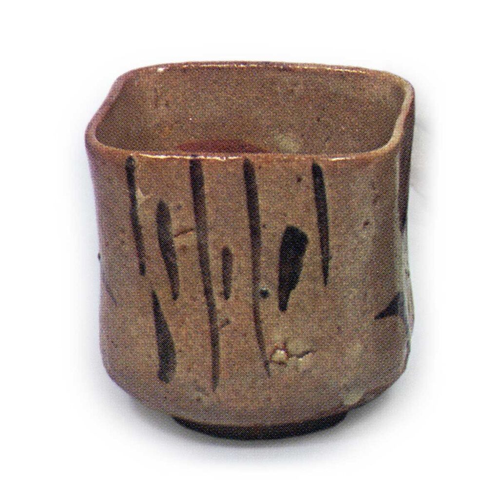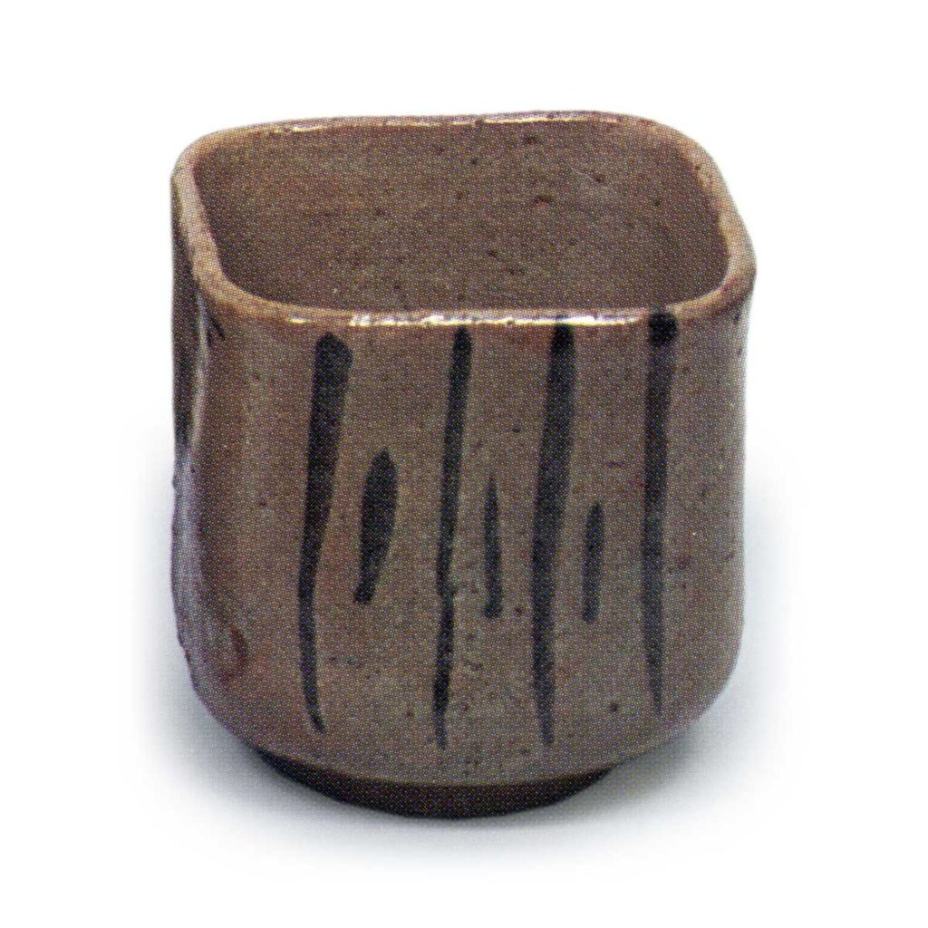 绘唐津芒纹四方向付 唐津绘唐津芒纹四方向付 2025.08.05 绘唐津芒纹四方向付 绘唐津芒纹四方向付 高度7.8厘米 口径7.1×7.2厘米 底径4.5厘米抚四方的筒形向付,胴部以粗笔触交替绘制芒纹与纵向纹样。高台的制作手法在唐津烧中较为罕见。窑址不详。