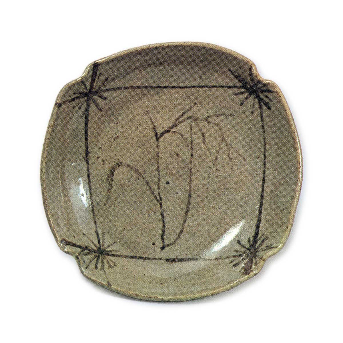 绘唐津芒纹四向付 唐津绘唐津芒纹四向付 2025.08.05 绘唐津芒纹四向付 高度4.6厘米,口径15.8×16.1厘米,底径5.7厘米圆形盘的四角被捏入内角形成的向付,盘面中央饰有芒状纹样,线条优雅流畅。应为阿房谷窑作品。五件成套。