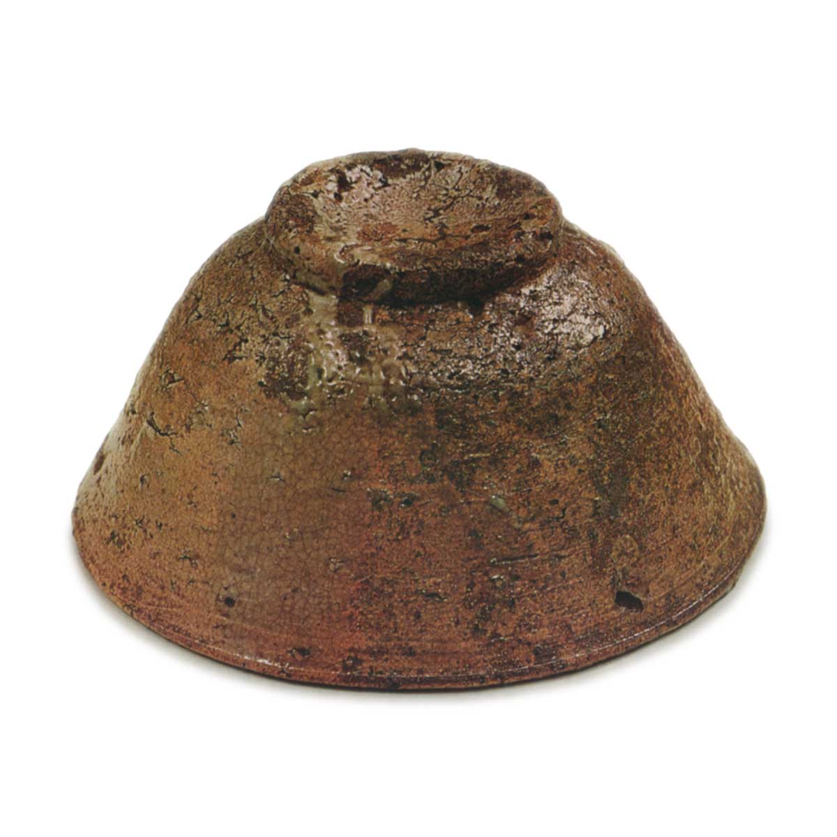 碗一侧的釉是烧焦的棕色伊拉釉,覆盖约三分之一的碗身,另外三分之二则覆盖着厚厚的蓝绿色伊罗釉。 此外,从边缘到足环外侧有一层特别厚的釉,在足环处颜色更深,形成一道美丽的风景。在另一面,足环处有两个清晰可见的手指印,这也是一个巧妙的场景。 碗内侧的井釉明显刷过两次,其中一次笔触沿边缘水平方向延伸,另一次笔触从边缘斜向碗中央。刷过的地方的井釉也呈现出强烈的蓝色,裂纹粗糙。棕色胎体上的焦黄色釉也很漂亮。