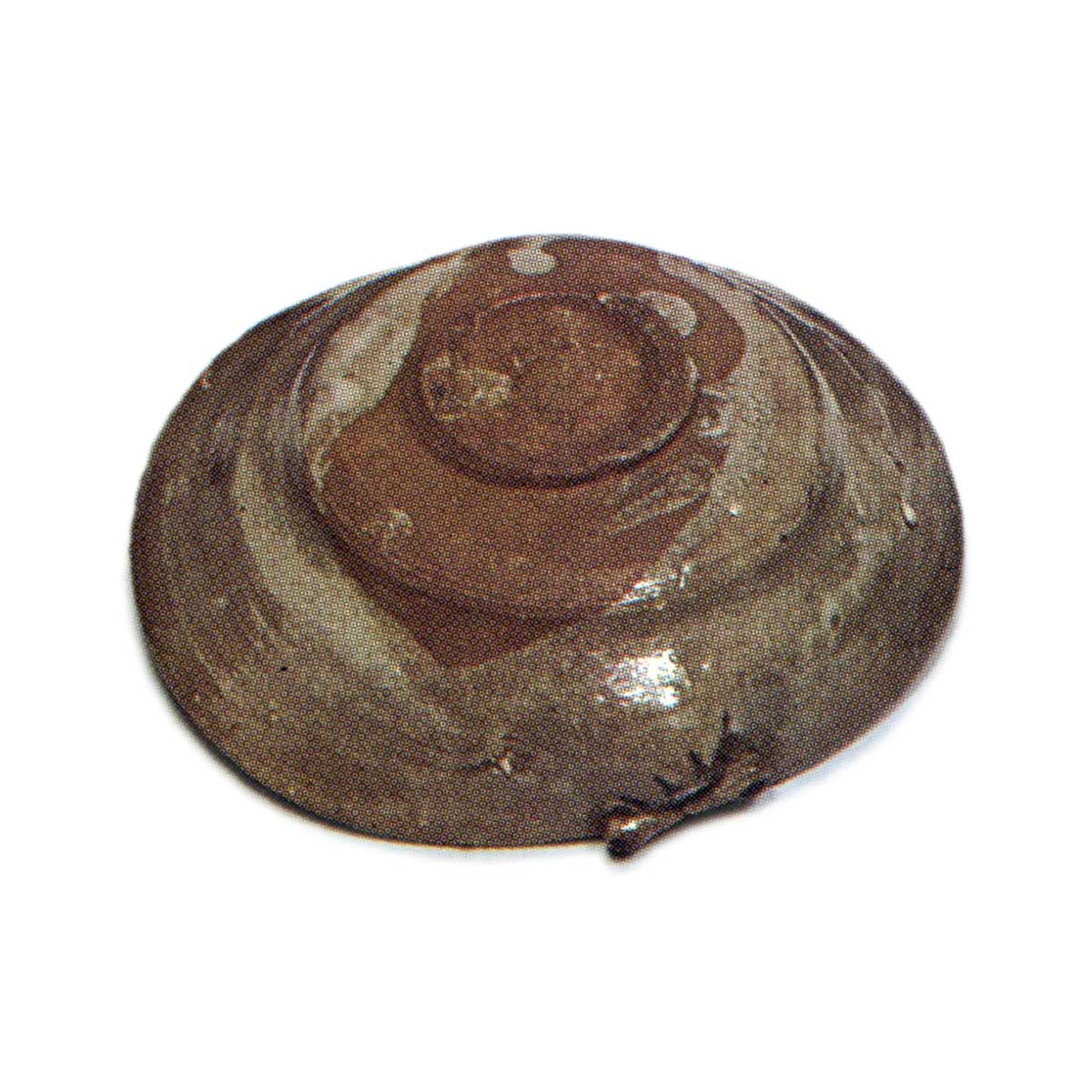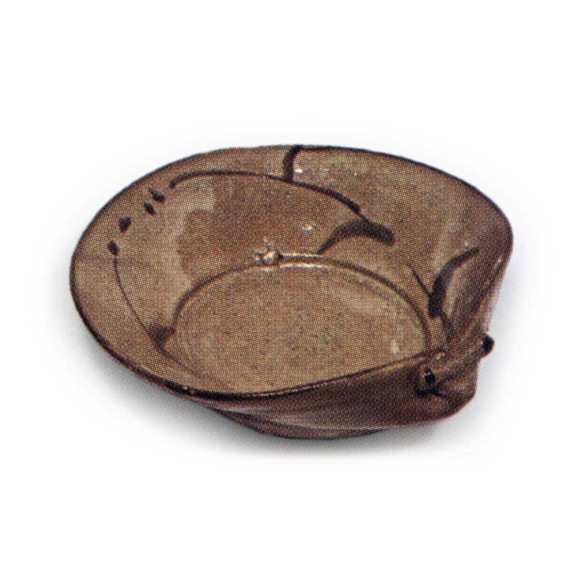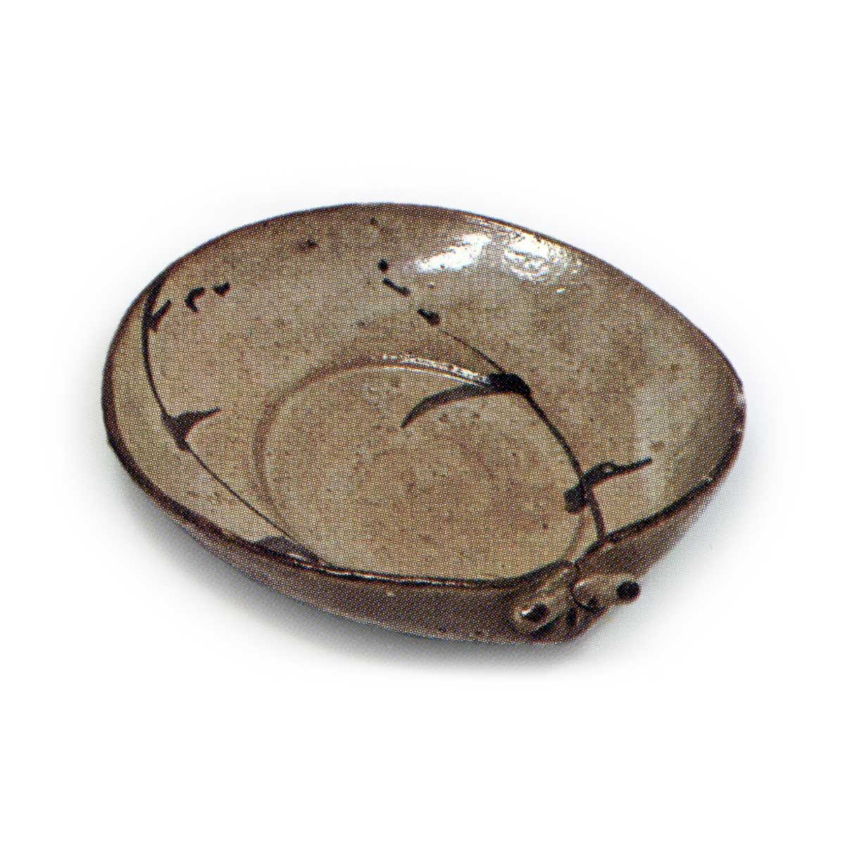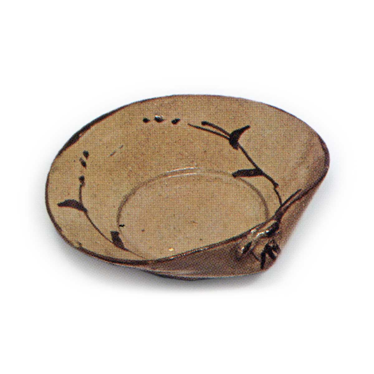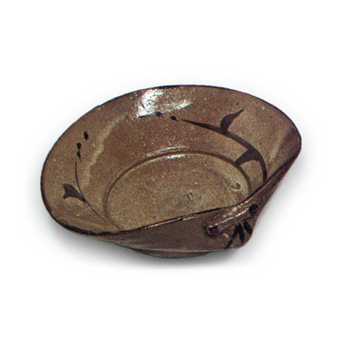 绘唐津草纹蛤形向付 唐津绘唐津草纹蛤形向付 2025.08.05 高度5.3厘米,口径14.4×15.4厘米,底径4.7厘米这是一款造型独特的蛤形向付,五件成套完整。内侧两侧绘有草纹图案,高台部分以小巧的造型削制而成。应为甕屋谷窑的作品。