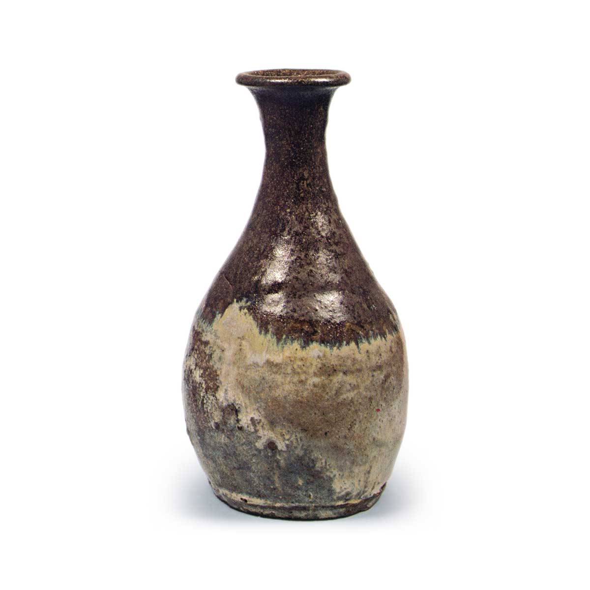 朝鲜唐津德利 唐津朝鲜唐津德利 2025.08.05 朝鲜唐津德利 高度20.2厘米,口径5.5厘米,胴径10.7厘米,底径8.1厘米田中丸收藏这是一款典型的敲打成型德利,口部尖锐地向内扭曲。上部施以黑色釉,下部则涂抹稻草灰釉,釉面自然变化,形成美丽的纹理。