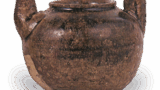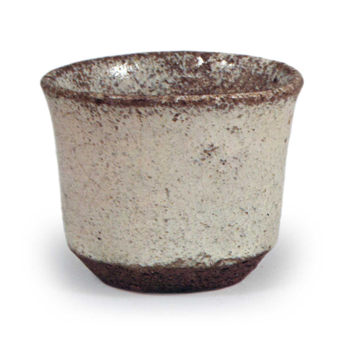 腰部环绕,略微张开,直立的造型,内外涂有稻草灰釉,是帆柱窑典型的斑唐津呑杯。