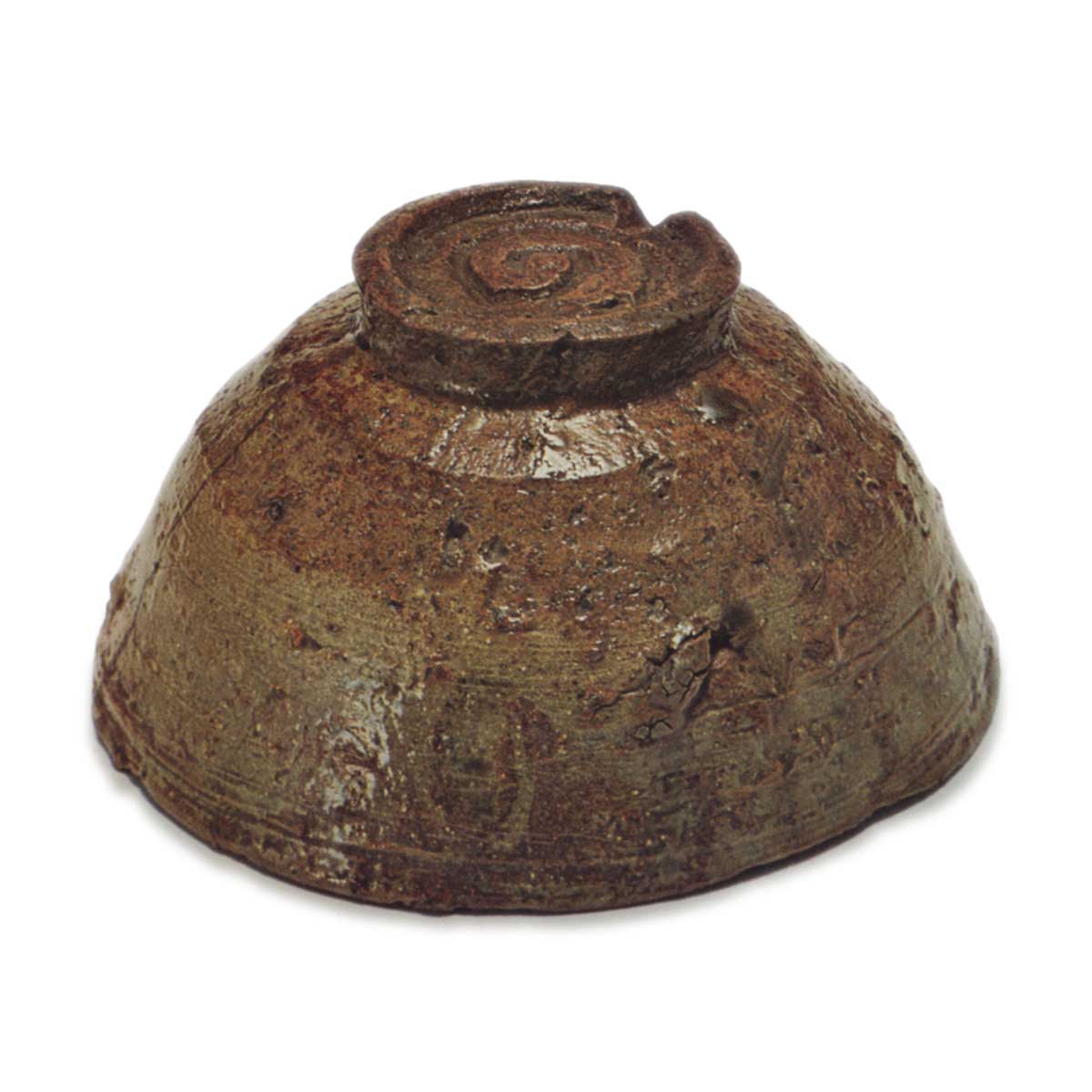 碗底是未上釉的陶器,虽然不是竹节,但很结实,一侧已经断裂。碗内是平的,有一个弯曲的凹痕,看起来像是用粗钉子用力雕刻而成的。这些手都有相同的习惯,似乎是由同一个人制作的,但都是高品质的作品。有两行刻痕相对。