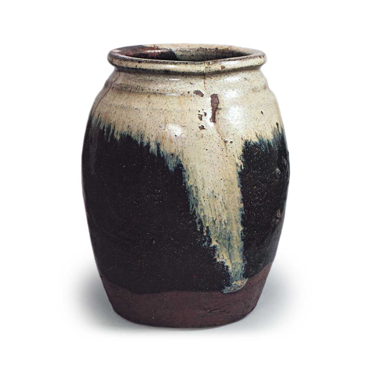 朝鲜唐津水指 铭廬瀑 唐津朝鲜唐津水指 铭廬瀑 2025.08.062025.11.14 朝鲜唐津水指 铭廬瀑 高度17.1厘米 口径10.1厘米 底径9.4厘米藤田美术馆形似种子罐的水指,略显厚实。由于采用敲打成型,底部呈板状,底部涂有黑釉,从口部到肩部厚涂白濁色的稻草灰釉,黑色釉面上白釉如瀑布般流淌的景色极为精美。因其被称为“廬瀑”,在茶人之间享有盛誉,想必是因为在朴素的器形中,釉色景色鲜明地活灵活现。 目前尚无法确定是藤川内窑还是高取内ヶ磯窑的作品。