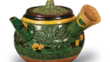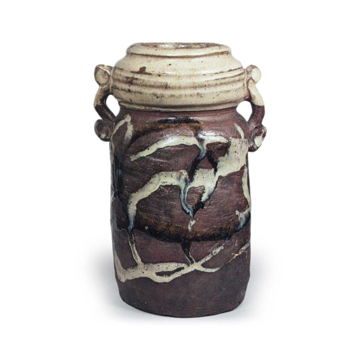 朝鲜唐津耳付花瓶 唐津朝鲜唐津耳付花瓶 2025.08.06 朝鲜唐津耳付花瓶 高度18.5厘米 口径8.0厘米 左右12.7厘米 底径9.0厘米出光美术馆朝鲜唐津的陶器除了有藁灰釉与黑釉清晰分隔的类型外,还有如本品般在素地肤面上以笔触涂抹黑白釉的款式。此花瓶为其中最精良的制作,左右耳形虽显刻意,但整体稳重沉稳。成型采用敲打成型法,底部为平坦的板起, 主体部分大致呈四方形。 紫褐色焦灼的素地肤上涂抹着浓稠的釉料,乍看显得繁复, 但用于茶室却出人意料地效果显著。