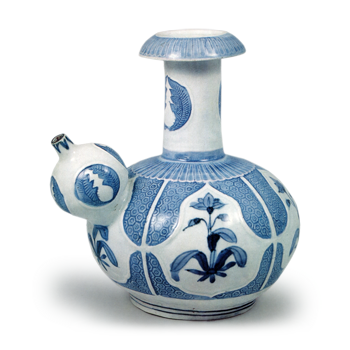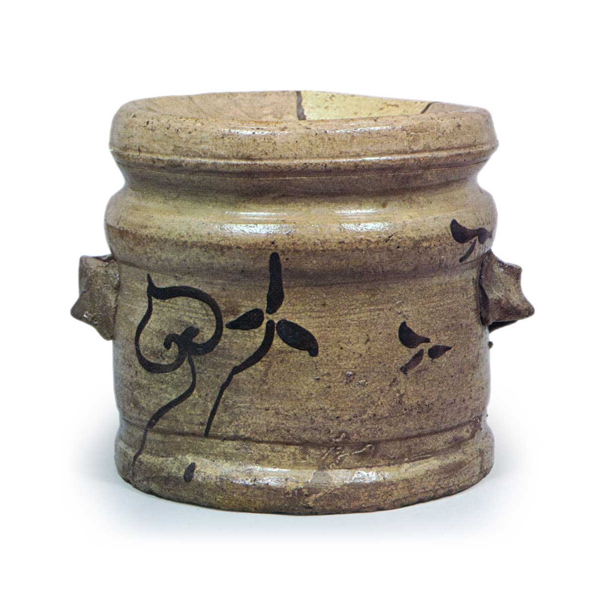 绘唐津水草纹矢筈口水指 唐津绘唐津水草纹矢筈口水指 X Facebook Hatena Bookmark LINE Pinterest 复制 2025.08.062025.11.14 绘唐津水草纹矢筈口水指 高度18.0厘米 口径18.9厘米 底径18.9厘米林原美术馆该作品模仿了美浓和备前烧制的矢筈口水指的形状,志野的水指没有带耳的胴体,反而更接近备前矢筈口水指的制作风格,但绘唐津中没有其他类似的例子。胴部绘有葵、泽泻、网干枪梅等图案。成型采用敲打制作,内侧残留青海波状敲打纹,内底刻有“×”印。应为藤川内系或甕屋谷窑烧制。
