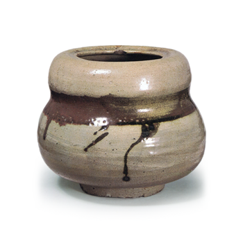 绘唐津瓢形水指 唐津绘唐津瓢形水指 X Facebook Hatena Bookmark LINE Pinterest 复制 2025.08.062025.11.14 绘唐津瓢形水指 高度17.6厘米 口径11.7厘米 胴径19.0厘米 底径13.8厘米信乐和伊贺烧制的重饼风格瓢形水指,是较为罕见的制作例。胴体上下饰有木贼、芒草及松叶纹样, 口部周围及胴体一侧施黑釉,其余部分施长石釉。 平坦的底部亦施釉, 残留淡淡的釉痕。 牛石窑出土有类似黑釉斑驳的陶片, 推测可能出自同一窑炉。