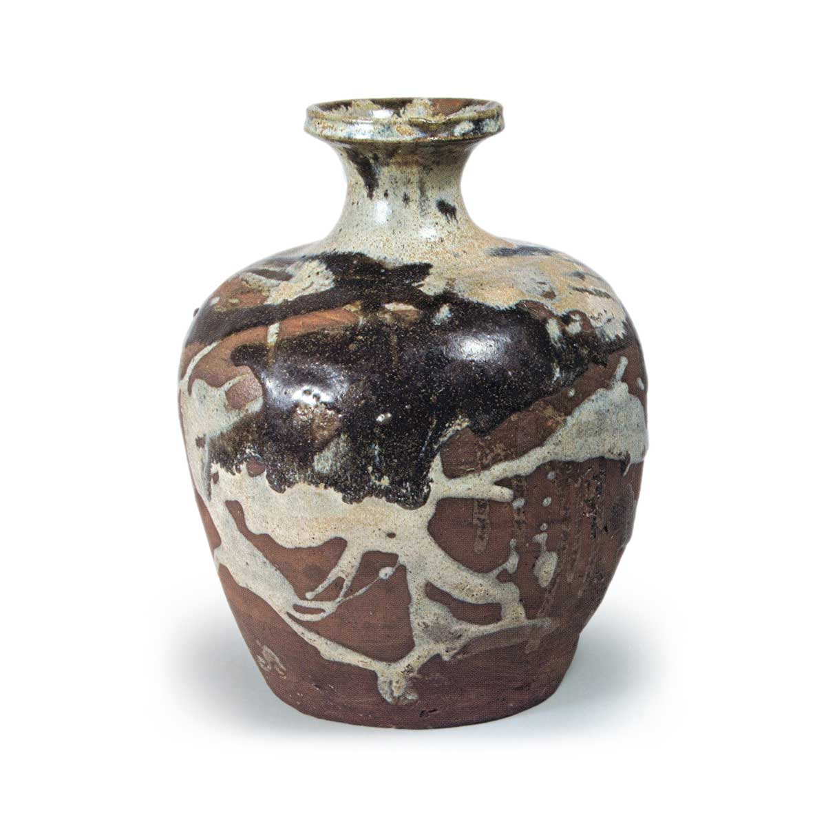 朝鲜唐津大德利 唐津朝鲜唐津大德利 X Facebook Hatena Bookmark LINE Pinterest 复制 2025.08.06 朝鲜唐津大德利 高度23.4厘米 口径7.5厘米 胴径18.5厘米 底径12.5厘米肩部隆起的宽口大德利,底部为平底。口部至胴部随意流淌着白濁釉与黑釉,属于朝鲜唐津风格,在同类舟形德利作品中堪称杰作。应为藤川内窑或高取内ヶ磯窑的作品。