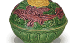 柿釉色淡黄,双层流釉在腰部以下停住,形似蜷缩的猴子。其轻盈不沉重的特点,反而增添了雅致,显得风雅,想必是侘茶人喜爱的物件。自明治初年被静嘉堂收藏以来,直到最近才在茶会上亮相,如今终于能一睹其可爱的风采。配套的茶盖有五个,均为名品,颇具深意。