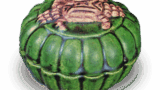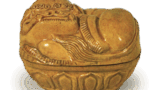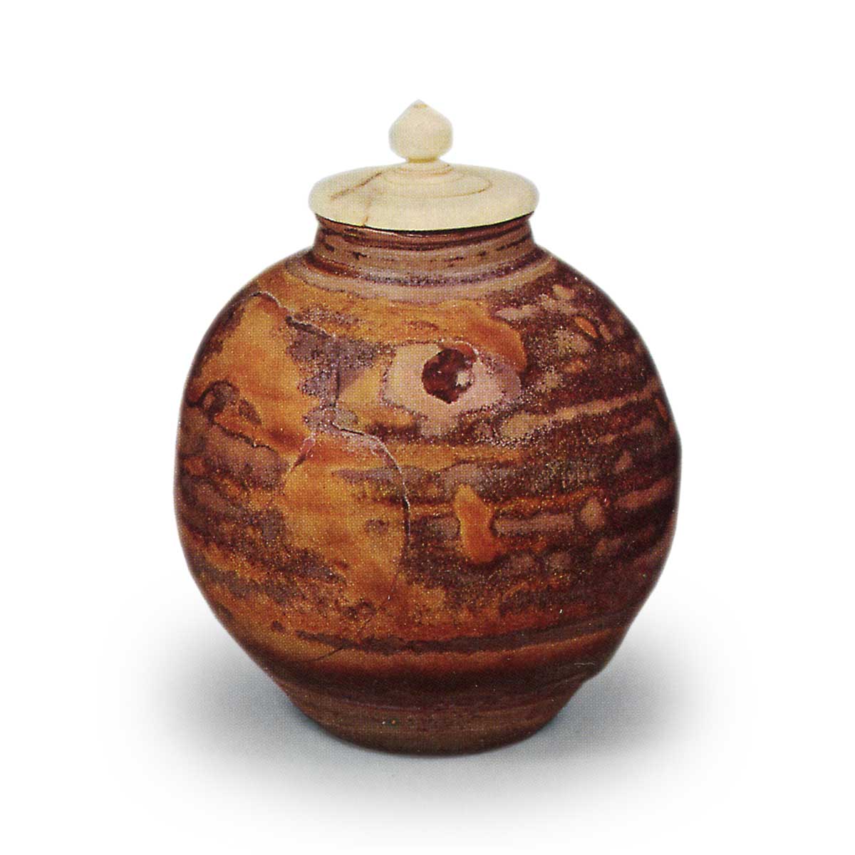 此茶入为略高圆润的文琳形。茶釉略带黄色,云纹盘旋的景色优美,作为摆件亦可观赏。