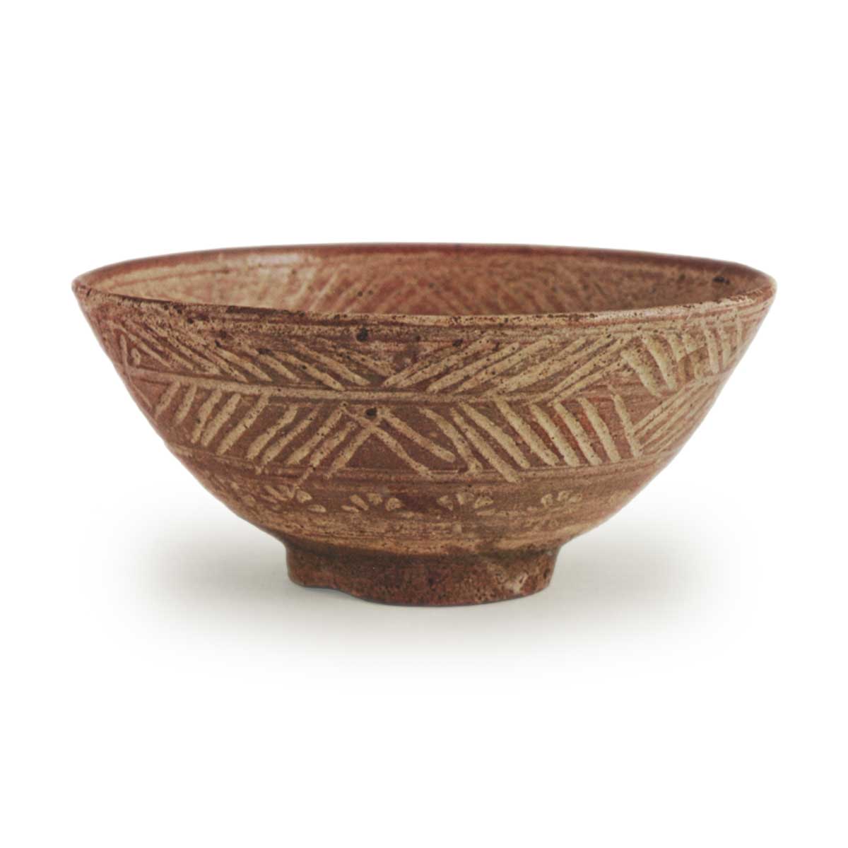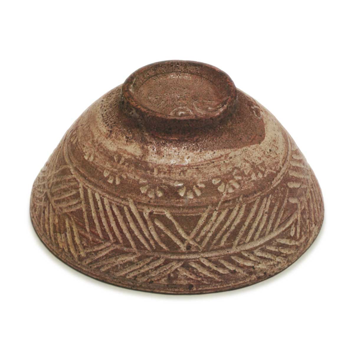 这个雕刻的三岛茶碗整体呈红色,雕刻风格粗犷。桧木图案内外两层,雕刻粗犷,像钉子一样,给人一种深沉的感觉。雕刻的图案稍薄且整齐,被认为是质量较低且较晚期的作品。 碗内壁装饰有两排花形图案,滴水孔内也有一朵花形图案。八只眼睛环绕着这个图案,这是外层花形图案的承诺。碗外壁装饰有两排花形图案,然后是单朵花形图案,即所谓的外层花形图案,总共十六朵花,这也是外层花形图案的承诺。 碗底由细红土制成,白色笔触图案被擦掉,形成白色镶嵌,上面涂有水釉。足环由粘土制成,内部覆盖有头盔状脊,形成褶皱纹理。指纹也是这件作品的一大特色。