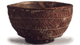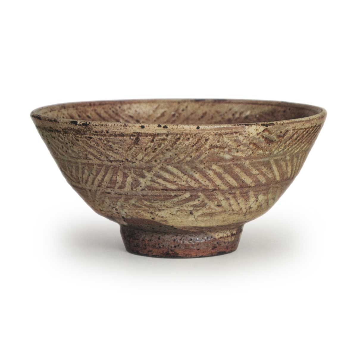 碗呈浅碗状,边缘平坦,由一个大的竹节状碗脚支撑。碗厚实坚固。 外侧有三排所谓的桧木雕刻图案,用工具斜着雕刻而成;内侧有围绕边缘的两排桧木雕刻图案,围绕壶身的七朵花图案,以及在其上方的两排十三朵花图案,内外侧的花图案和桧木雕刻图案都镶嵌着白色粘土。 白色镶嵌是在红色粘土基底上涂抹白色粘土,然后用湿布擦拭,填充雕刻线条和花朵图案,最后擦去器皿其他部分的白粘土。然而,由于白色粘土并未完全擦去,在器皿的腰部和内部,仍可隐约看到白色粘土,这也成为茶碗的风景之一。