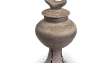 此茶入正如其铭,形似枪鞘。口部低矮紧贴肩部,肩部前端至底部略呈弧线,线条流畅优美,造形端庄,属同类中罕见的肩冲茶入。胴体中央划出一道中线,仿佛为保持左右均衡,口沿的切口也精准收束。