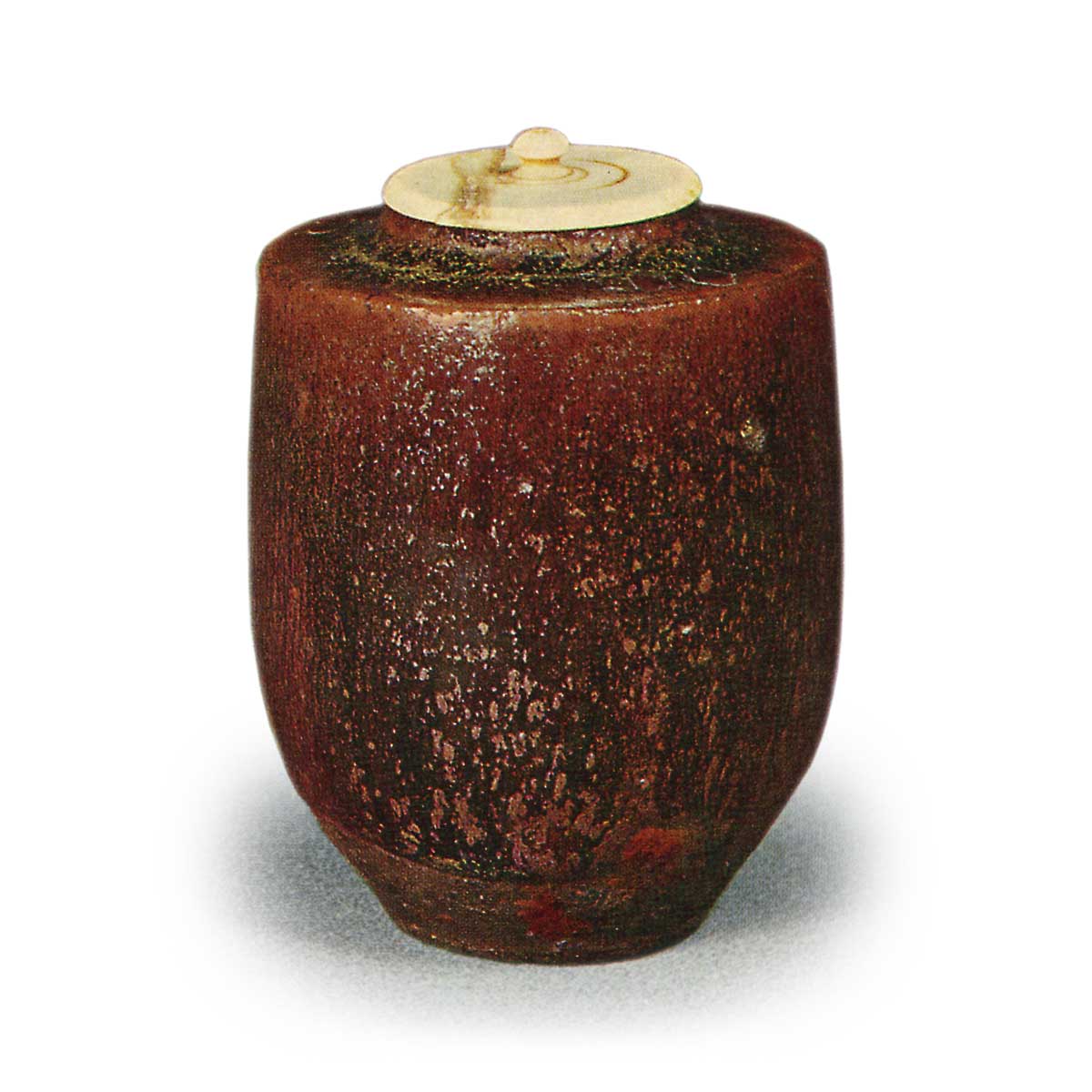 堪称古瀨户茶入中的异色之作。其形制尤为独特:口沿如猪首般深陷肩部,肩角略显尖锐,器身自肩部向下流畅延伸至底,收束如蓑衣农夫之姿。此茶入更具侘寂风韵。肩部釉色浓厚,肩外釉层渐薄,如禾穗般向下渐浓