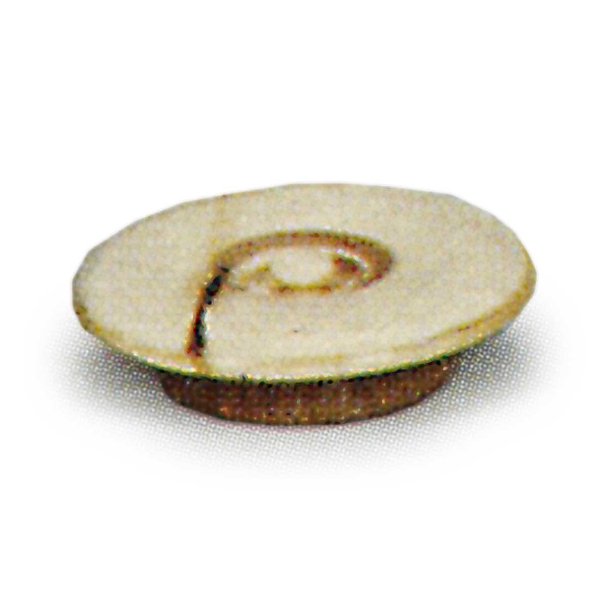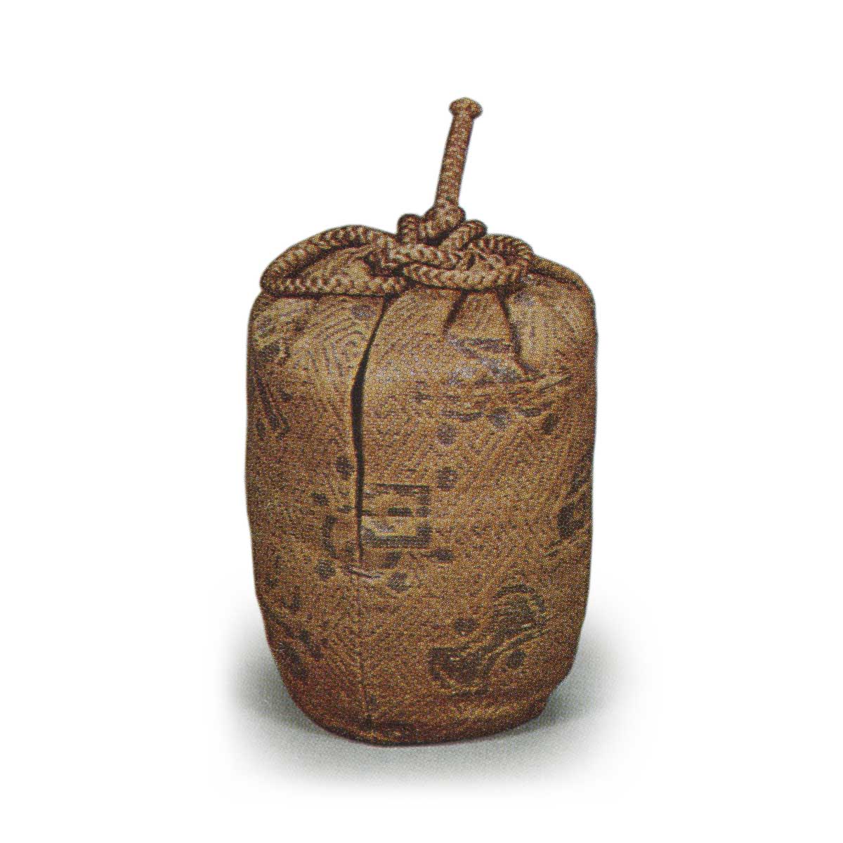 酒井空印乃远州门下弟子,以茶艺闻名。相传远州将此茶入赠予空印,乃为报答其特殊援助之情。此类茶入形制统一,肩部线条温润,裙边略显纤细,姿态雅致。通体覆以赤褐色釉,肩部区域显现黑色釉斑,前方有一道稍浅的釉流痕迹形成造型,裙边处可见略带金化的釉料积聚,此乃其特色。故有说将此类茶入称为“肩黑手”。胎土似为金华山土,质地略显粗粝。其间藏有署名为“京飞鸟”的窑分作品,据别所吉兵卫传书记载,此作系京都烧制。