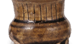 略带收束的胴形,底足呈现小石状凸起,通体釉色较本歌更显赤润,裙边金化现象较少,但整体浓淡相宜,姿态端庄秀丽。这正是其接近玉柏手本歌的明证。由此,增镜铭文亦合乎情理。