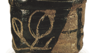 通体覆以墨色茶釉,釉面细密均匀。自坯体起至正面,黄釉如瀑倾泻而下,其中心釉色渐染墨釉,宛若垂直坠入瀑潭的景致。