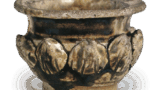 此手枕茶入有别于常见的华美佳作,其釉色清幽细腻,流淌的瀑布釉仅越过腰部一道凹痕便止于器身中部。这般寂然幽玄之姿,正是远州从众多茶入中甄选出的珍品。