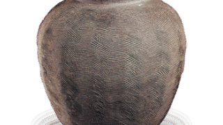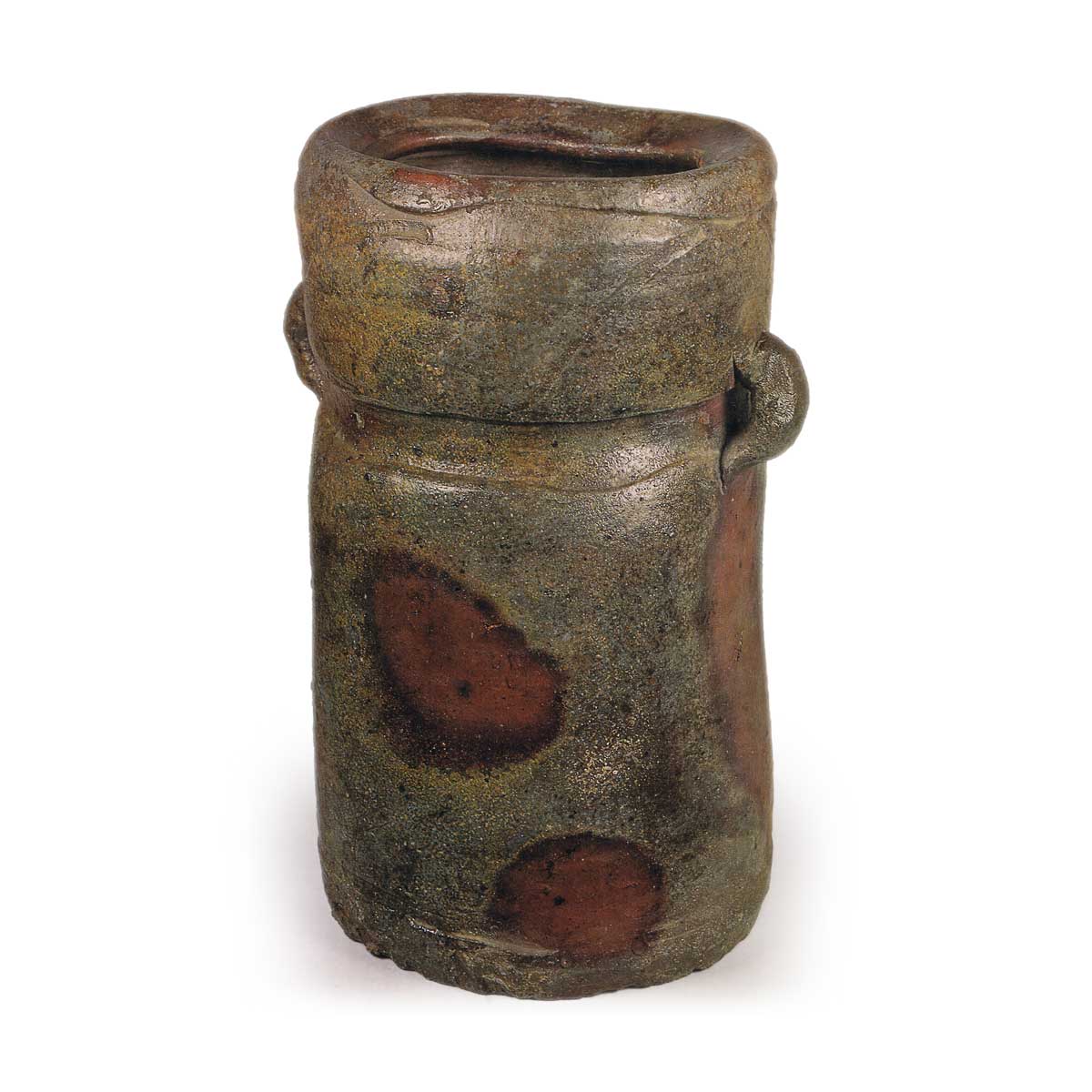 此为筒形花器,通过前后压制形成扁平造型,器身中部收束形成阶梯状凹陷。两侧随意附着略显小巧的耳部。口沿外侧呈圆润弧度,内侧反卷形成姥口造型。自耳部以上,从器身背面至正面浅浮雕桧垣纹样。此外,器身下缘亦环绕一道横向笤帚纹。此花生瓶窑变效果鲜明,整体近乎灰青色釉面中,正面呈现大小两处、侧面则有较大面积如岛屿般赤红的烧痕,形成极富趣味的鲜明景致,局部还薄薄飘落着朽叶色芝麻釉。平底中央以笤箩纹刻画单线直纹,或为窑印。口沿前后各穿有细小挂耳孔,现已填平。箱盖内侧贴纸题有“元文二巳九日 太郎庵所藏备前细水指 承让者”字样,题者不详。太郎庵应为党党斋原斋门下茶人太郎庵良斋。此器如今多作花器使用,但昔日作为细水指用于茶席的痕迹犹存。因原持有者之名,故得“太郎庵”之称。