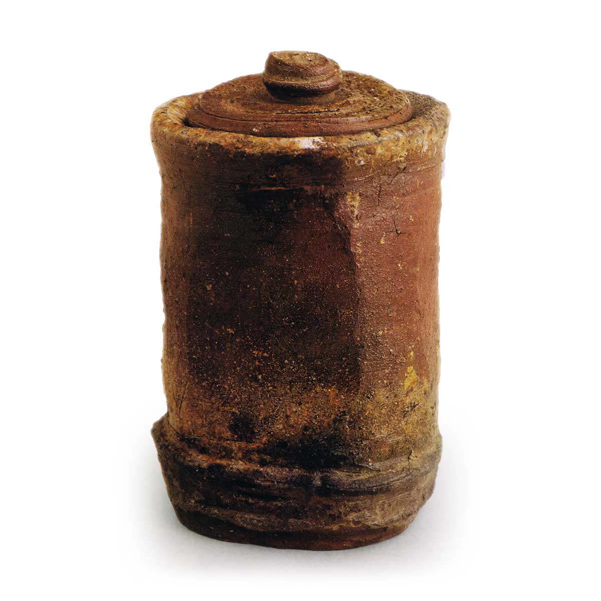 备前细水指 备前备前细水指 2025.09.062025.11.14 备前细水指 通盖高22.2厘米 身高19.9厘米 口外径13.8厘米 底径11.5厘米 藤田美术馆在小型细水指中堪称造型最精妙的典范。口沿设阶梯状过渡形成箭簇口,筒形坯体经轆轤拉坯后经削制形成不规则面,棱线却未显尖锐而保持温润。因削坯处理,器底形成阶梯状台阶,呈现厚重稳健的质感。釉色变化并不丰富,口沿与底缘处灰釉沉淀形成胡麻釉,局部呈现焦黑痕迹。虽无法确定是否为原配盖,但所附厚盖表面同样覆有胡麻釉。盖面蜗牛状的盖钮更添趣味。内壁刻有“イ”字形凹痕,底面亦深刻“一”字。底部为平底。