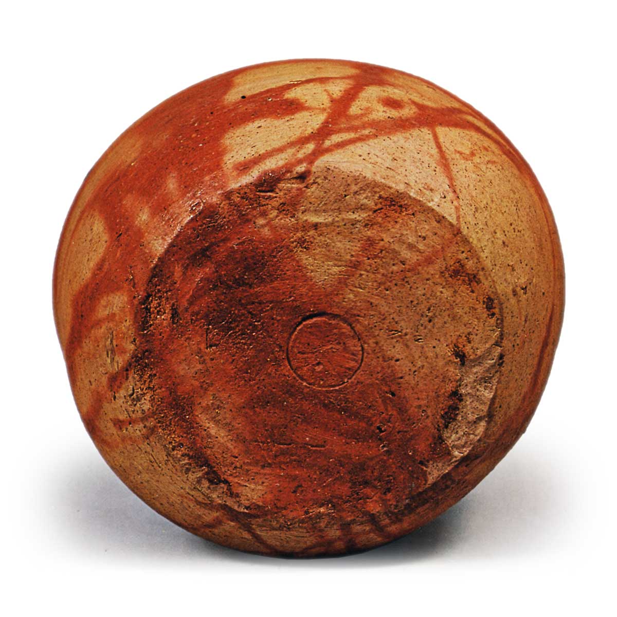 作为绯襷纹烧成亦属上乘,胎土柔润洁白,其上绯红襷纹自由舒展,口部整体泛着朦胧红晕。器身有细微石櫨纹,平底中央刻有“○”字。底面残留环形托痕,部分已缺损。