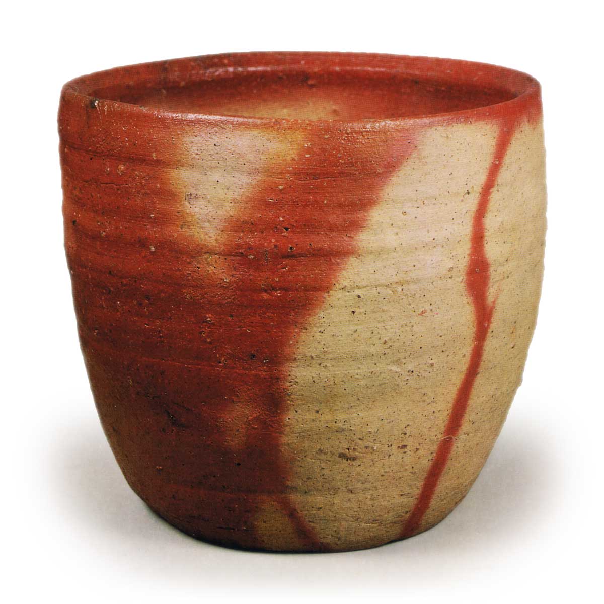 备前绯棒棒先水指 备前备前绯棒棒先水指 2025.09.062025.11.14 备前绯棒棒先水指 高13.9厘米 口径15.2厘米 底径10.0厘米自宽阔口沿至底缘,以舒缓曲线流畅收束的造型,俗称棒先形。虽在绯襷水指中可见数例,此作堪称同类中的杰出名品。口缘平直内倾,棱线挺拔明快,令整体姿态更显紧凑。底面平整,器身环绕轆轤纹。绯襯釉烧成效果尤为精美,其土胎洁白柔润的质地堪称绝品,其上粗细不一的襯纹或如晕染般鲜明显现。器底刻有“ハ”字,侧面上部以刮刀刻出“⑤”字印记。此器为黑田家传世之物,其匣盖正面题有「古备前水指 真田烧」。