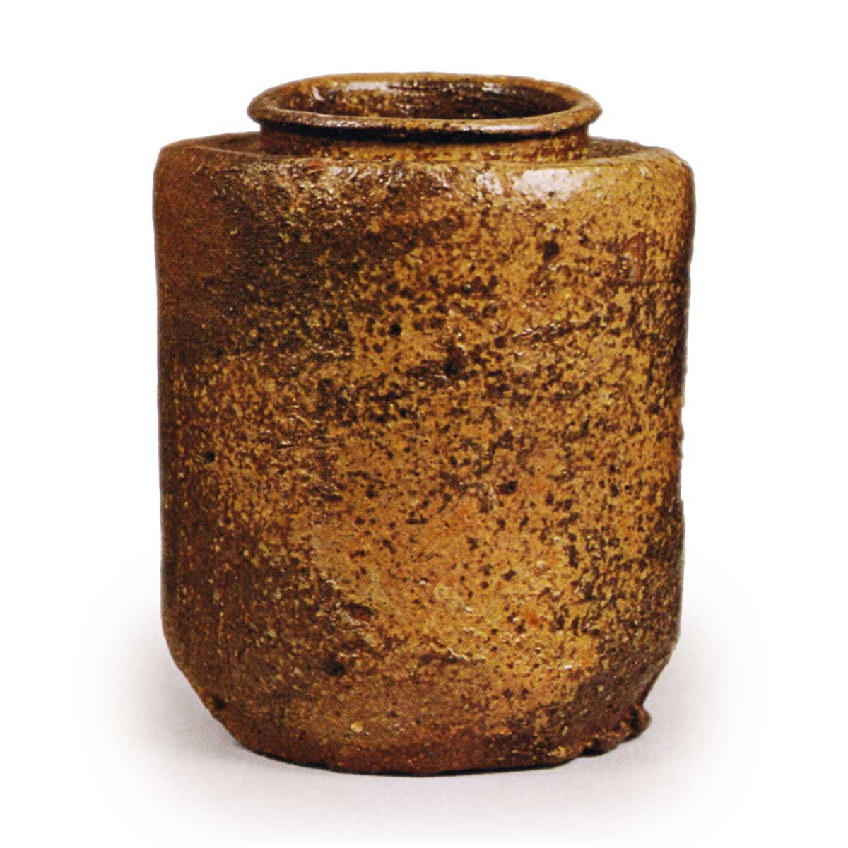 此为典型的桃山风格肩冲茶入,低矮的口沿向外锐利地扭转反卷,器身三面各饰两道纵向箍带,略微外凸的腰部经面削处理。底为平底,刻有“六”与“C”双印。一侧自口沿至耳部及胴身薄施胡麻釉,另一侧则显露褐色素坯烧结质地,局部泛出微红光泽。